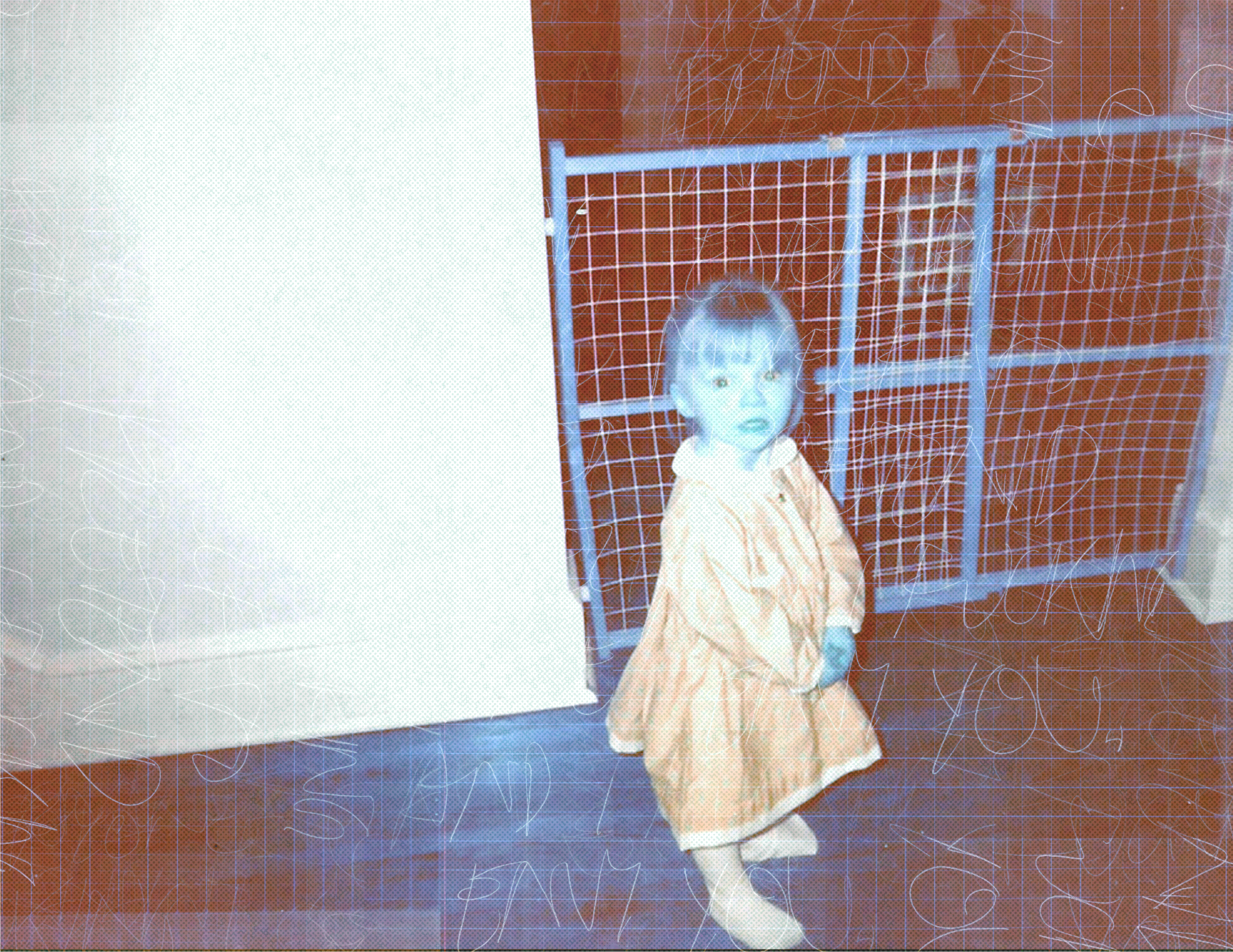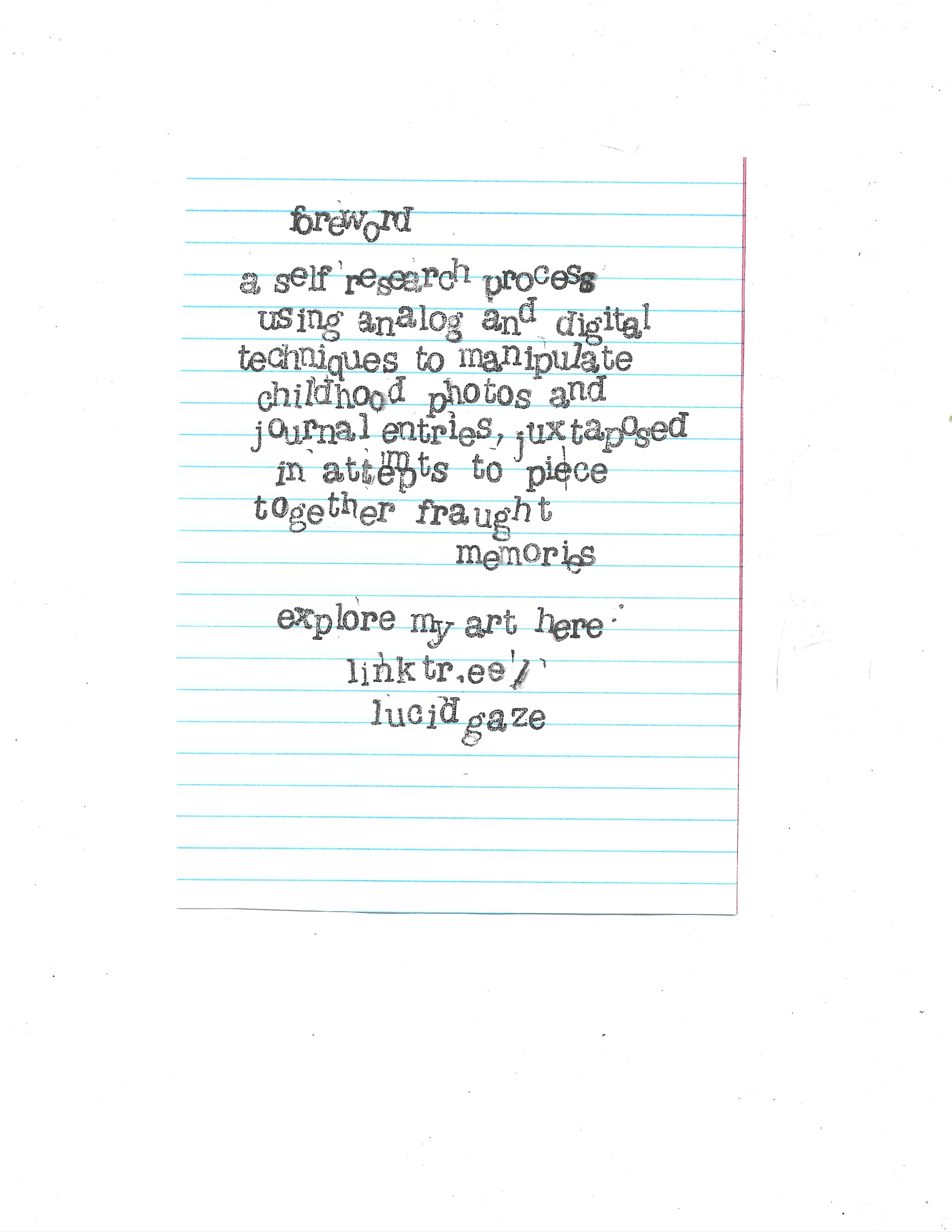 “foreword: a self research process using analog and digital techniques to manipulate childhood photos and [later] journal entries, juxtaposed in attempts to piece together fraught memories.”